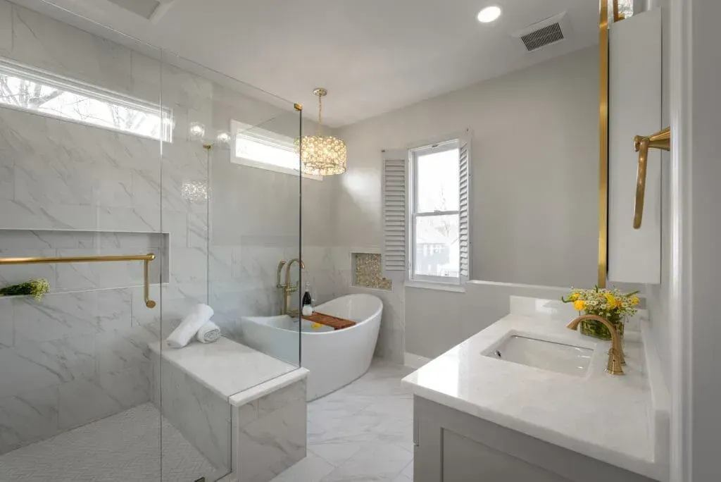 Transform your bathroom into a luxurious retreat with Rhino White Hard Marble countertops from Stone Showcase! This stunning marble features soft white tones with subtle veining, adding elegance and brightness to the space. In this Atlanta, GA home, the countertops complement the gold fixtures and sleek, modern freestanding tub, creating a spa-like atmosphere. The matching marble shower bench ties the design together, making this bathroom both beautiful and functional for daily relaxation.