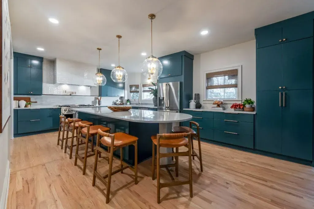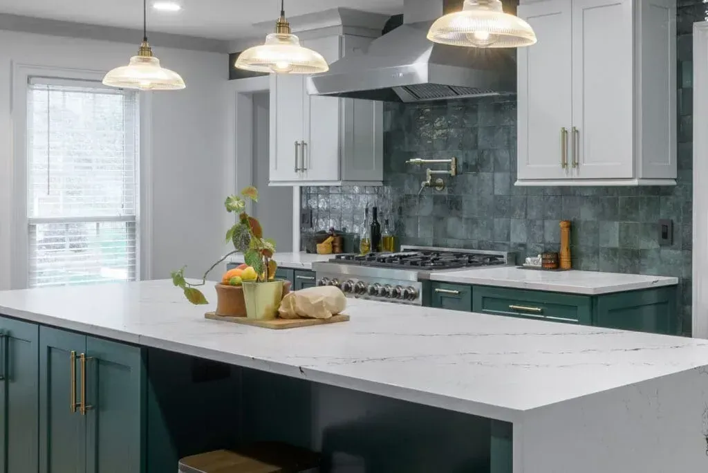 - Functionality: Durable quartz countertops for easy maintenance and a seamless, waterfall-edge island for a refined touch