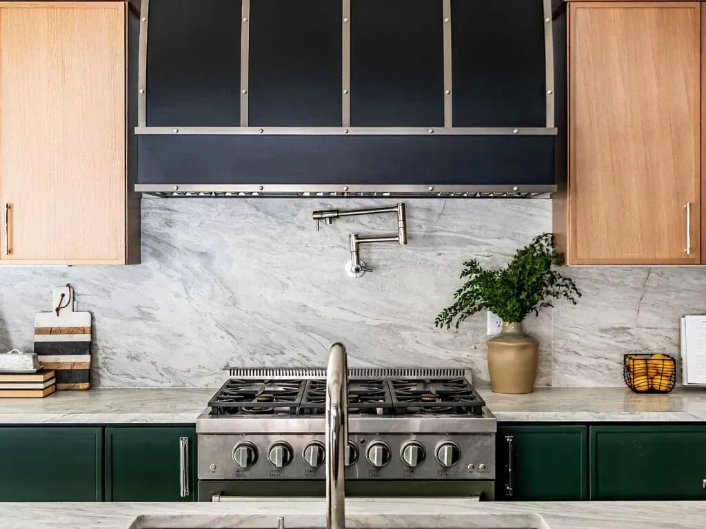 Designed by Egypt Sherrod of Indigo Road Design Group, this kitchen balances bold color with natural texture. Deep green lower cabinets, light wood uppers, and a custom black metal range hood all come together, grounded by the elegance of Milano Quartzite. The oversized island provides seating for six, making it perfect for casual family meals or effortless entertaining.