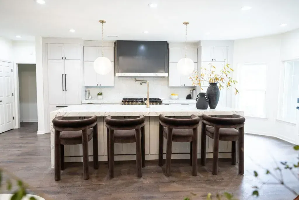 This elegant kitchen in Woodstock, GA features stunning Impeccable Quartz from Spectrum Quartz, bringing a clean and sophisticated touch to the space. The soft gray cabinetry pairs beautifully with the marble-like veining in the quartz, creating a timeless and inviting aesthetic. A striking wood range hood adds warmth and contrast, while the chevron backsplash enhances the overall design with texture and movement. The spacious layout, paired with these durable and low-maintenance countertops, makes this kitchen perfect for both daily use and entertaining.