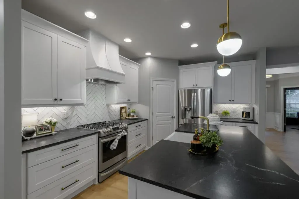 You’ll love how the River Black Granite countertops make your kitchen stand out! The deep black stone with its subtle white veining creates a bold, modern look that feels timeless. Paired with crisp white cabinets and a beautiful herringbone backsplash, this kitchen is both stylish and practical. The large island is perfect for meal prep, family gatherings, or hosting friends. Plus, the granite is super durable, so you can enjoy its beauty for years to come.